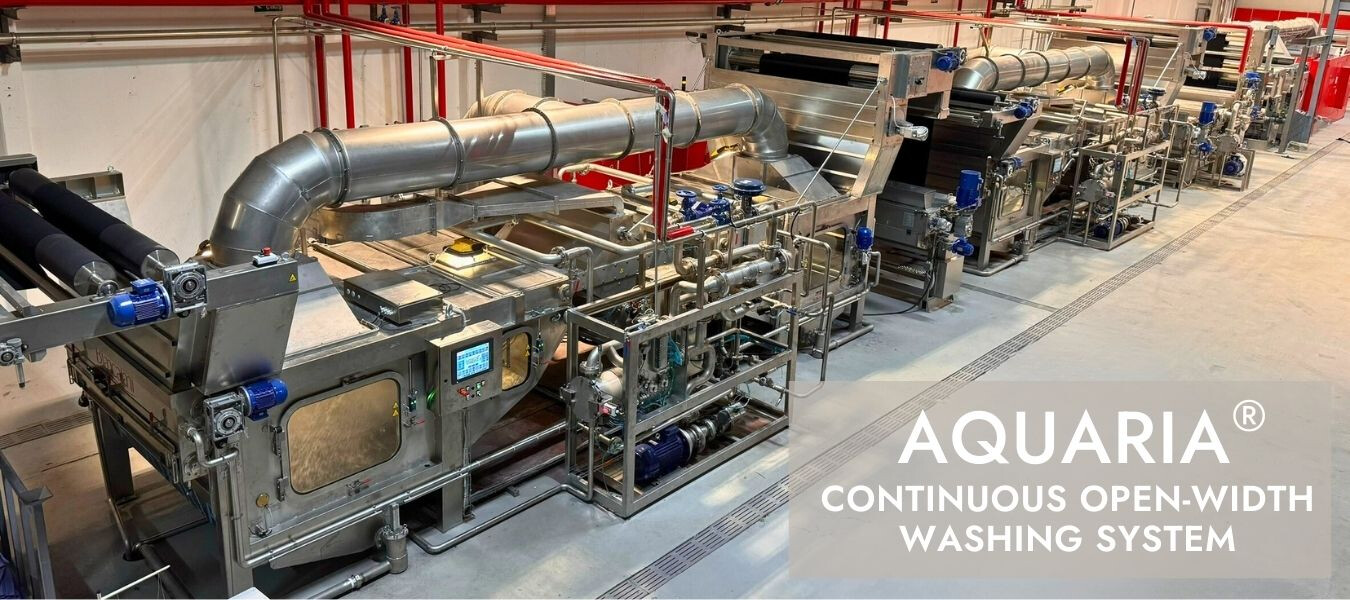AQUARIA® is a continuous open-width washing system designed to obtain deep and uniform penetration of the process bath through the fabric. The system combines three elements: controlled mechanical action, variable residence times (thanks to an adjustable fabric accumulation from 20 up to 500 meters), and high-speed airflow that forces the bath through the fibers.